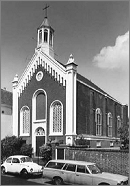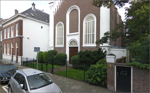 1e de Riemerstraat 1. De Katholiek Apostolische kerk uit 1868, in eclectische/neo-romaanse stijl, is ontworpen door C.W. van Capellen.
